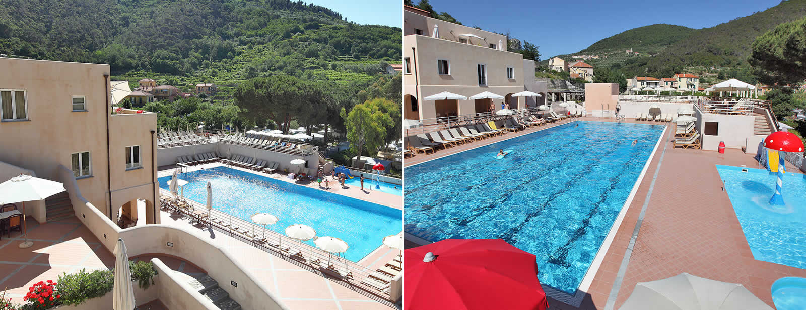 L'Hotel Villaggio di Giuele di Finale Ligure dispone di 2 bellissime piscine: una semi-olimpionica di 25m x 12m a profondità variabile (da 2 a 3.5 metri), ed una più piccola di 10m x 4m a bassa profondità con diversi giochi d'acqua come il fungo d'acqua e lo scivolo. Insomma un'offerta ideale sia per adulti che bambini, che in questo modo possono scegliere ogni giorno di andare in spiaggia con la navetta gratuita fornita dall'hotel o rimanere in piscina e rilassarsi a bordo vasca nell'area relax con idromassaggio, aeromassaggio e lama d'acqua.